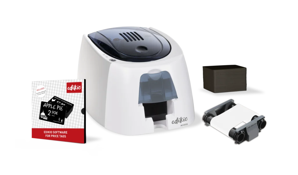 Compatta e discreta, la stampante Edikio Access è progettata per stampare cartellini prezzi su una sola facciata nel formato carta di credito.